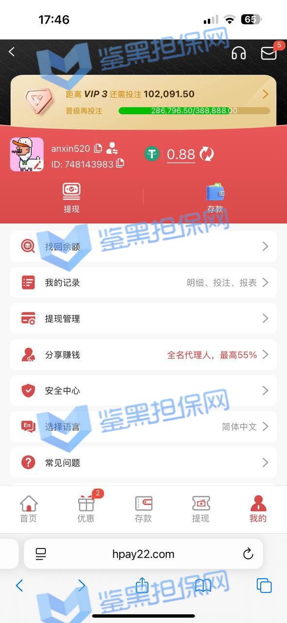 2、鉴黑担保网维权专员与此会员沟通情况,对方表示通过推广活动充值500元领取活动,盈利至18000后,对方要求重新完成18000*20=360000流水后才可以提款,理由竟然是有其他账号申请优惠,但是无法提供其他账号进行核实。