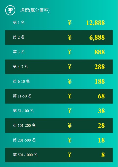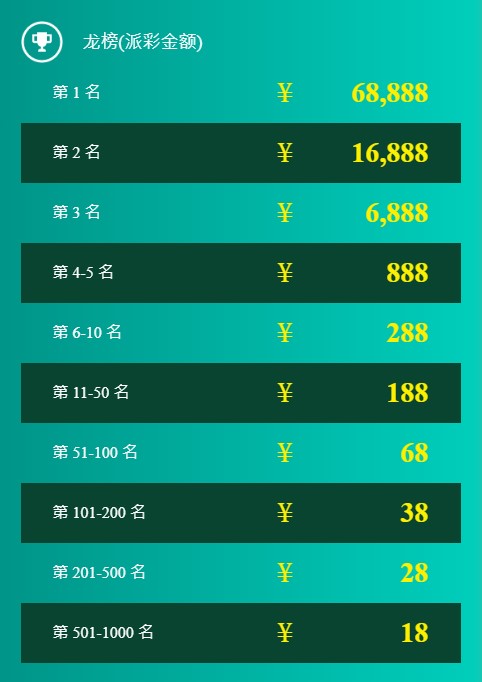 5. 龙虎榜奖金将于每周四结算时间后48小时内直接派发至玩家帐户,敬请玩家留意帐户余额。